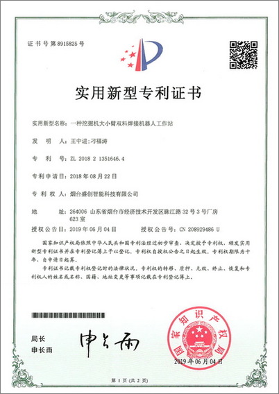 近日,公司獲得“一種挖掘機大小臂雙料焊接機器人”實用新型專利證書。